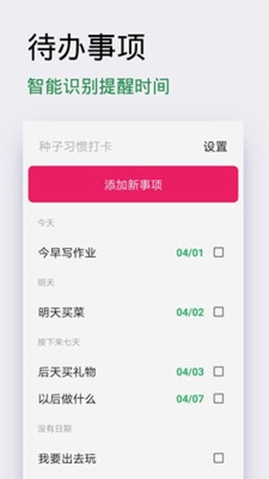 种子习惯打卡是一款坚持打卡签到的时间管理软件。致力于挖掘生活中的精华,并整理出来通过知识讲解和打卡,帮助大家告别拖延症,改变现状,您可以设定一些小日常小目标,希望能伴随你养成好习惯。生活更美好!
