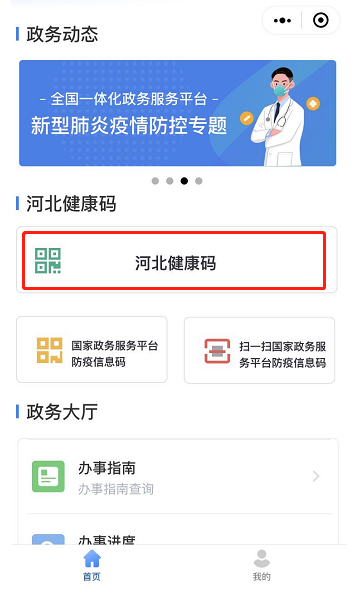 打开微信→搜索“冀时办”→按提示进行授权登录→选择“河北健康码”。
