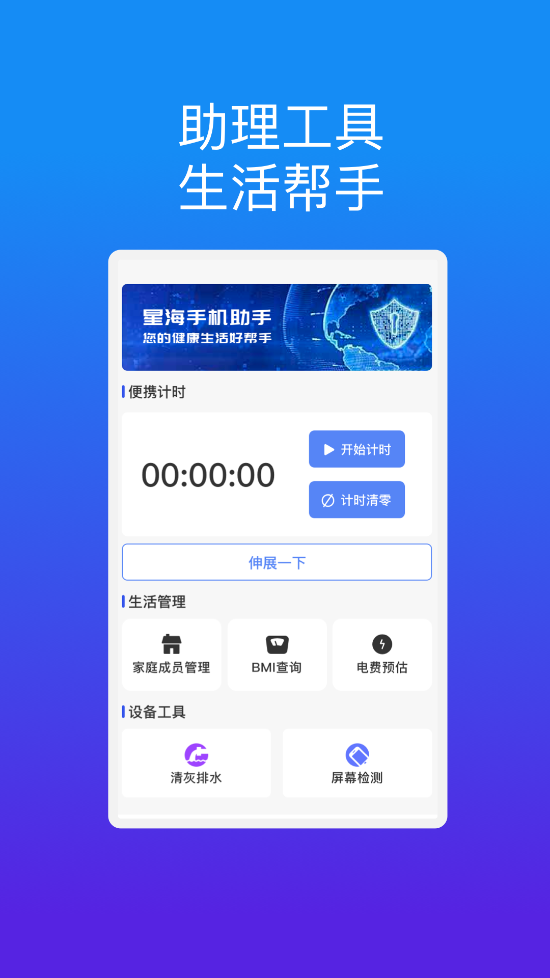 星海手机助手是一款及时查看手机信息,实现内存清理等操作的手机助手,智能化管理,保证系统安全和流畅度,平台还带来了其他的福利,例如计时、电费预估等功能,都是免费的,一键去体验,让日常生活更为便捷,每个功能开启也不需要权限,一键设置更便捷,秒速完成操作吧。