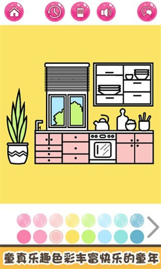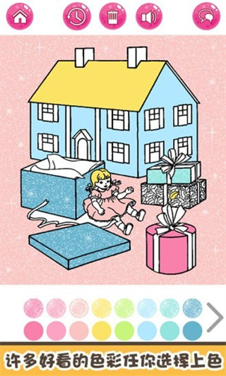 1、这个作品中的画面清新且简洁,拥有卡通可爱的背景,玩家可以在游戏中选择自己喜欢的图片进行填色,拥有解压且好玩的内容。