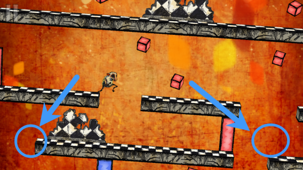 3、并且每一张的地图都是不一样的,有正常前进的,还有像下图这样向下跑得,还会有一些地图是倒着跑等各种奇怪的方法。但是玩家们只要记住,不同的地图的但是前进的方法永远是一样的,主要注意跳跃的时机就可以了。