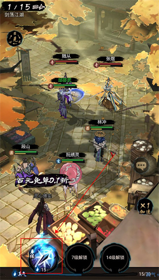 3、进入战斗后,无需玩家操作,武侠们会自动开始回合制战斗,玩家可以手动释放下方主角技能。