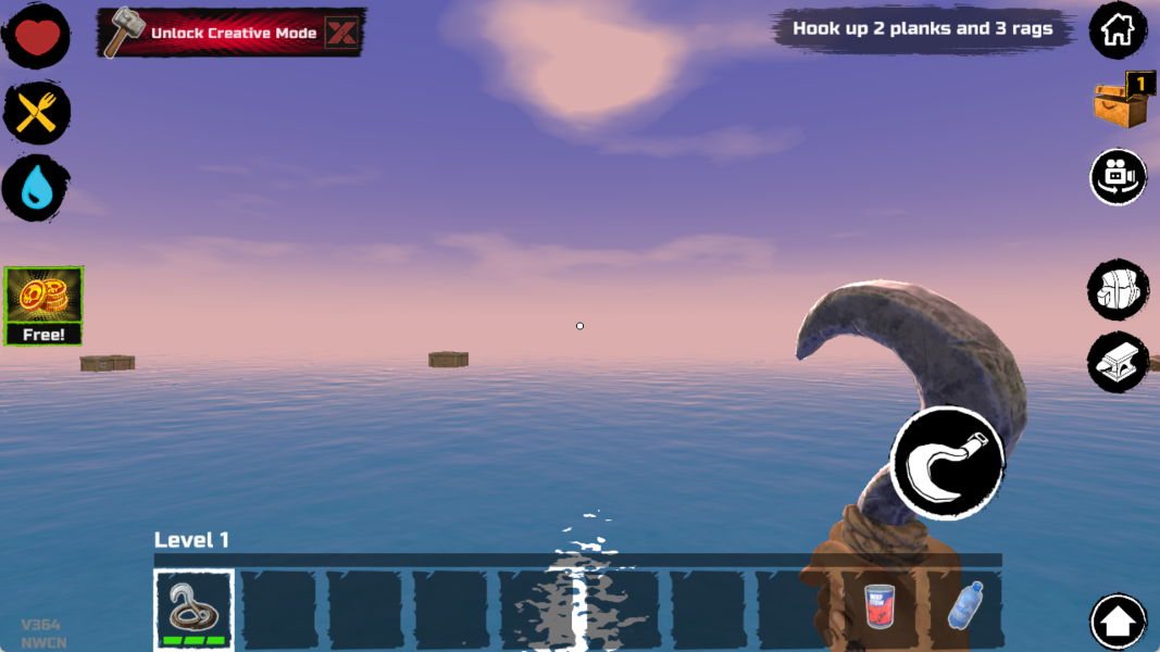 1、局时利用钩子收集海上漂浮的垃圾,注意不要漏木桶,勾不到就下水捞,快速获得更多资源。