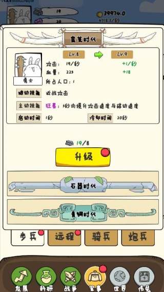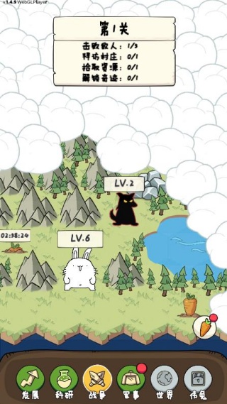 2.玩家需要通过发展、科研、战争等方式来推动胖兔部落的发展。如下图,在战争面板中玩家可以挑战其他部落以此扩大地盘。
