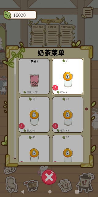 3.玩家能解锁各种品种奶茶,不同奶茶吸引不同客人,解锁更多奶茶吸引更多客人。
