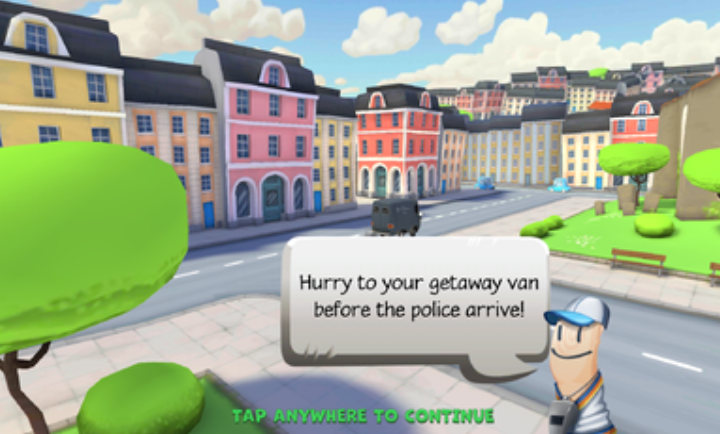 1、开局点击屏幕继续,按提示迅速前往 getaway van,避开警察并尽快抵达目标车辆推进关卡。