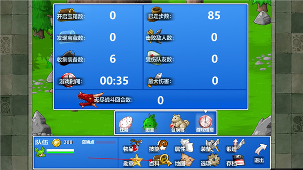 2、查看统计界面的步数、装备数量等数据,借助任务、招募等功能推进进度,积累游戏资源。