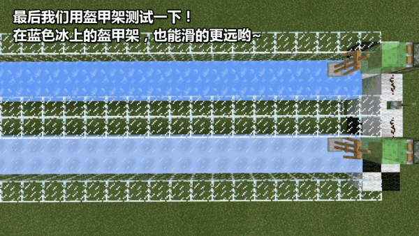 盔甲架测试的结果也相同,在蓝色冰上用活塞推出的盔甲架会滑的更远呢