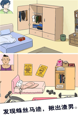 游戏由搞笑漫画风格进行设计,关卡多多,每关都有渣男出轨的证据,找出线索才能顺利过关!