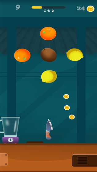 2、被我们切开的水果会飞溅出果汁,这些果汁全部都收集在下面的杯子中,切更多水果可以收集更多果汁。