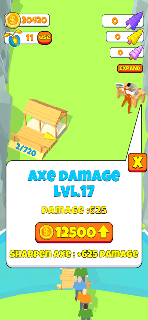 2、通过砍伐树木来赚取更多的金币,利用金币就能升级你的员工,提升他们的砍树效率。