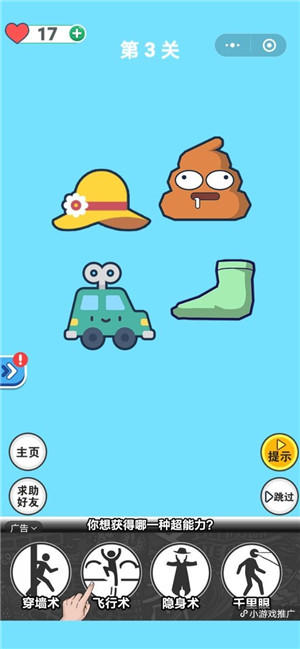 3、游戏中还能观看广告跳过关卡,还有新的提示可以选择,获得正确的答案。