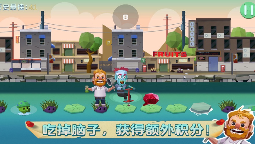 3、在陆地上面跳跃的时候,避开植物,避开所有可能阻挡的障碍,让你的僵尸继续前进。