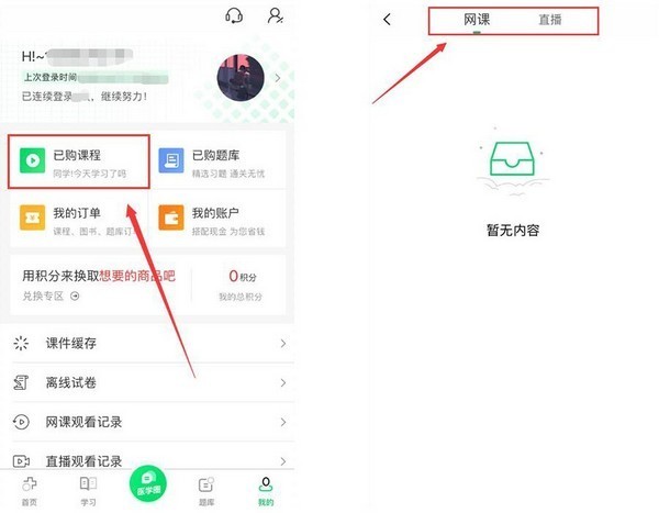 3、登陆之后点击已购课程,跳转到已购课程页面,可以选择网课和直播课,然后选择需要学习的课程进行看课。