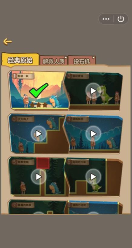 1、游戏分为三种主题模式,从经典的原始人挑战开始,学习石头射击技巧。
