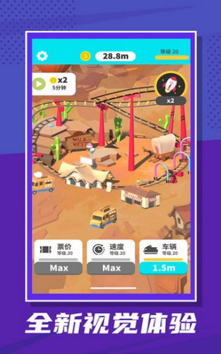 云霄飞车过山车大亨是模拟经营手游,玩家需要根据自己的蓝图建造各种过山车,开放游乐园吸引游客游玩,出售门票赚取收益,从而在解锁更多的地方建造更多的过山车,让你拥有自己的过山车游乐园,成为处于放松状态的顶级过山车大亨。
