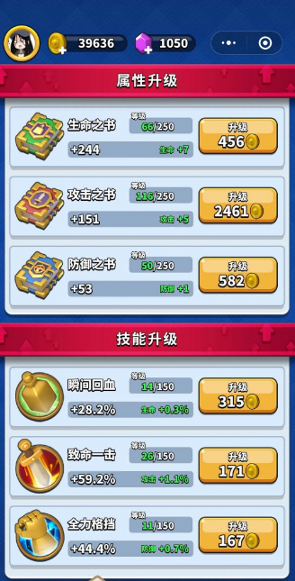 1、游戏中的装备有攻击、防御、生命三个数值,玩家需要均衡的将它们提升起来。