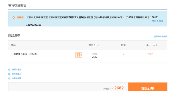 步骤四:如提示填写地址,则填写好地址以便网校为您邮寄教材,带‘*“为必填项;点击提交订单即可