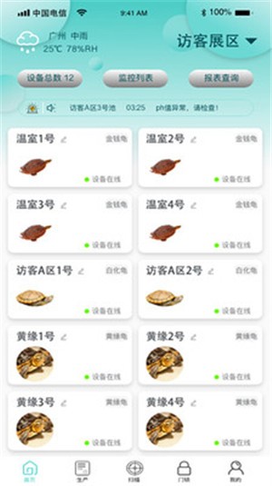 智龟平台是云中子科技公司推出的智慧养龟服务管理平台。系统实现了水体(溶氧,水温,pH),大气(温度,湿度,雨量,光照,),土壤(温度,湿度,电导率)的数据监测,设备远程开关(4台设备),生产管理功能(入池,消毒,饲喂,盘点),业务设置功能,查档功能。