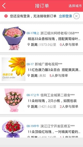 1、首页快速接单,挑选合意的订单,参与竞单等待经销商分配。2、点击导航接订单按钮,查看最新订单信息。3、点击首页热门地区列表,搜寻本地订单。4、经销商直接指定花店配送,确认接单,即可继续完成交易。5、点击首页导航右方立即下单按钮,填写并提交订单即可。6、登录会员后台,点击”我是经销商“中的发布订单选项即可立即下单。7、有急单别担心,点击找花店,指定花店配送订单。8、万家花店竞价,选择符合条件的花店,分配订单完成配送。