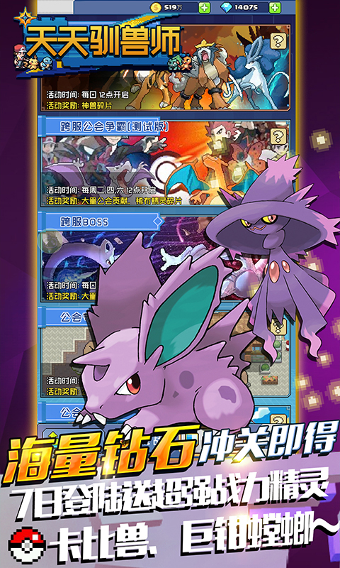 1、海量钻石冲关即得,7日登陆送超强战力精灵:卡比兽、巨钳螳螂~