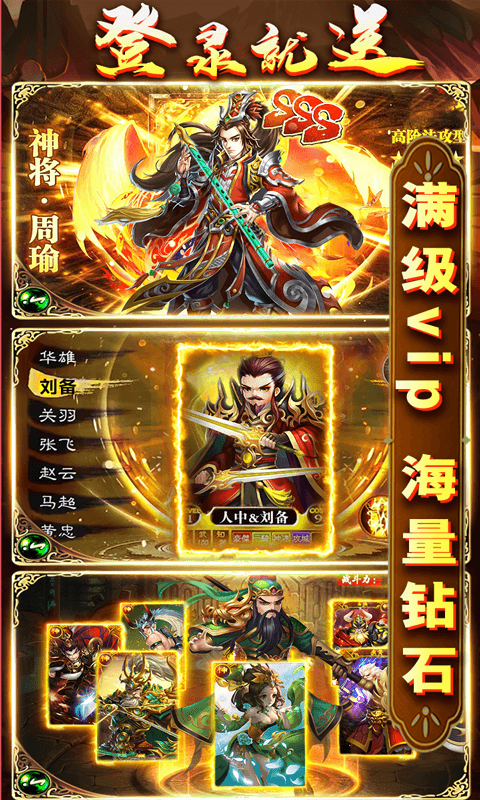 1、创角即送VIP20,88888钻石、千万金币、稀有神将,每天登陆免费抽充值卡,最高获得328充值;