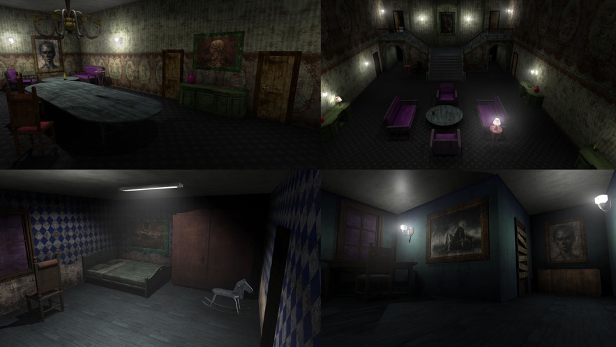3、逼真游戏场景,从餐厅到客厅,最后找到卧室,玩家不停的躲藏,不能被看见。