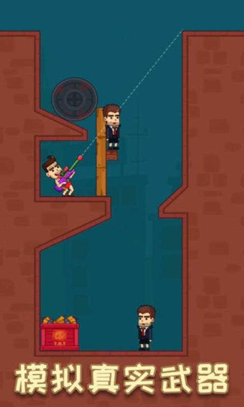 1、创新的采用了物理原理,利用一颗子弹完成击杀任务,注意子弹射击到墙上会发生反弹;