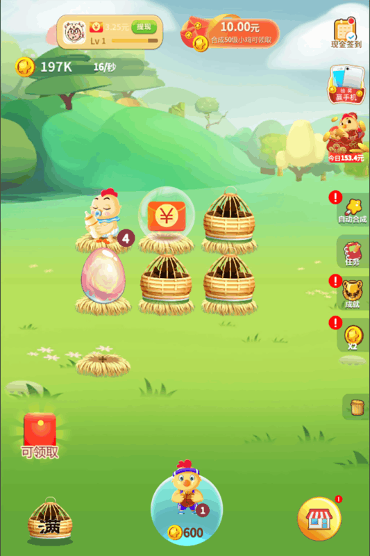 1、升级农场,合成高级小鸡,金币守护每秒翻倍,这些收益可以兑换成红包;