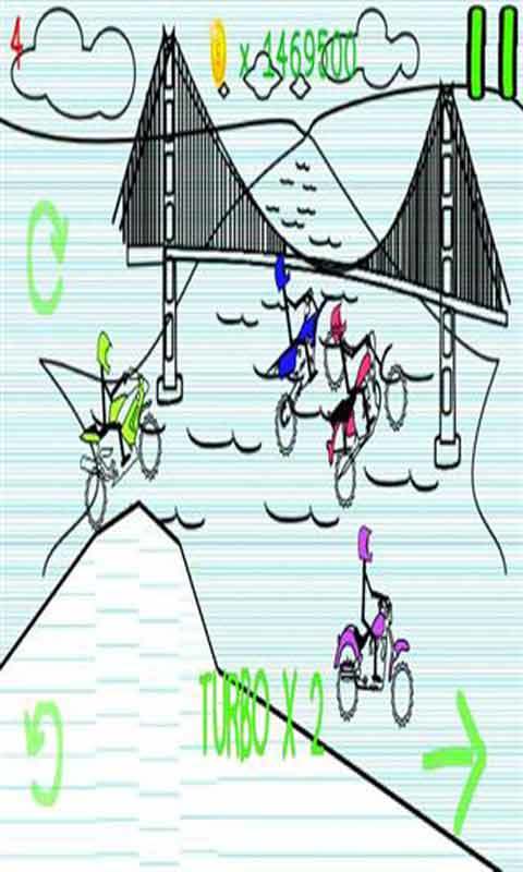 涂鸦摩托是一种简单的驾驶风格游戏,你在需要画你自己的摩托,在通过和关卡有很多不同的地形不同形状的轮胎可能会给你更高的速度奖励。让我们找到你自己的冠军。