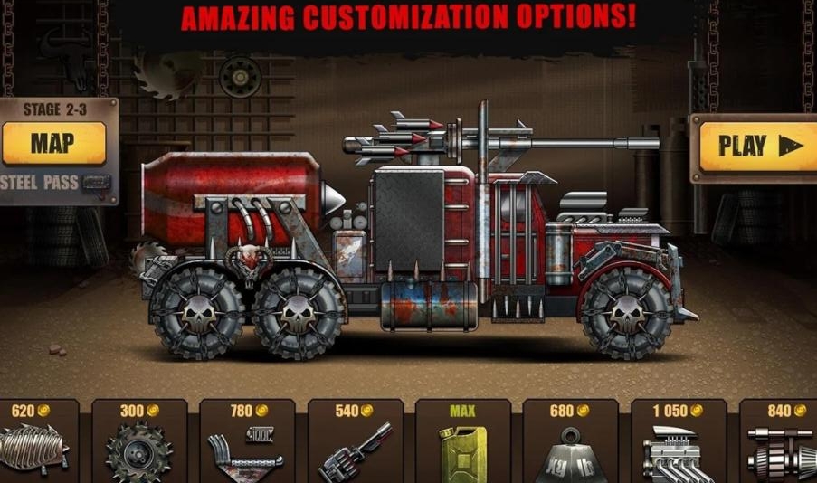 3、解锁最好的僵尸公路赛车,升级您的车,并且开发更强的加速系统。