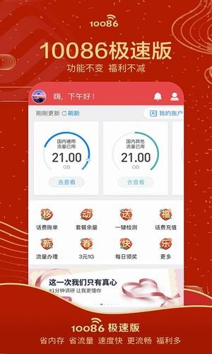 10086极速版是一款可以帮助用户更好的进行手机花费服务。10086极速版为用户提供许许多多的便捷功能,10086极速版包括花费查询、套餐查询、套餐选购、花费充值等。还有许许多多的优惠活动等待用户的参与,需要的用户不要错过。