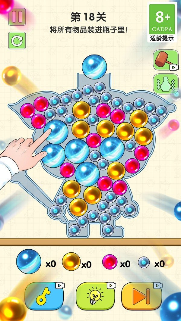 3、关卡挑战:游戏中有多个关卡,每个关卡都有一个空的瓶子和一些小球。玩家需要找到合适的方式将小球装满瓶子,同时避免小球掉落在外侧。每个关卡的难度逐渐增加,需要玩家运用逻辑思维和创造力来解决问题。