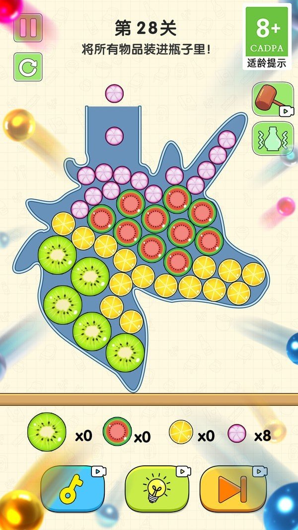3、多样化的关卡设计:游戏设计了各种不同难度和类型的关卡,包括球的形状、瓶子的大小等各种变化,增加了游戏的多样性和挑战性。
