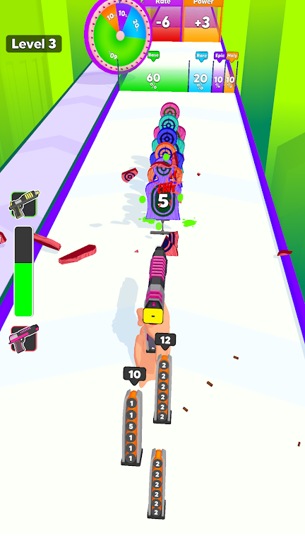 最快的射手,这款游戏将跑酷以及射击的元素组合。我们可以在跑酷的道路上使用枪械射击轮盘,射中轮盘上面的数字颜色可以获取不通过的道具哦。游戏合成的过程很有意思,你可以将枪械不断的合成获得更强大的武器哦,里面还有多方位的装备运用,值得游玩。