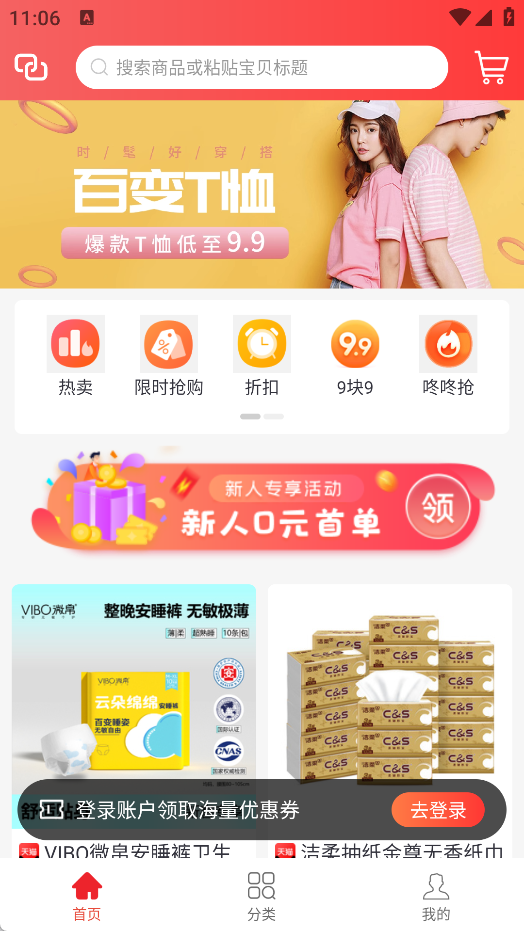 1、在首页中有热卖、限时抢购、折扣、9块9、咚咚抢等版块,同时还有新人0元首单的福利;
