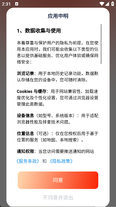 1. 下载并安装APP,点击同意,即可进入主页面;
