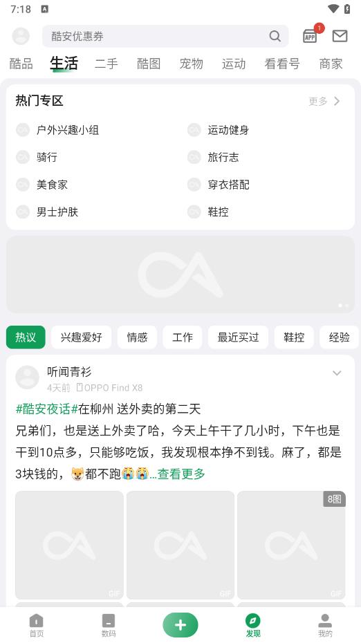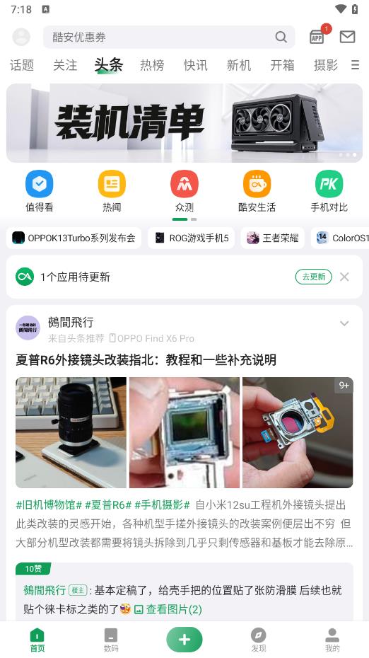 1、进入首页浏览热门头条、数码热帖、酷友测评和推荐话题内容。