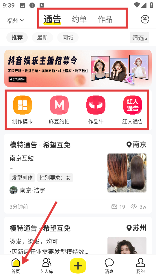 2、APP的首页界面顶部通告、约单、作品标签可切换不同业务场景,制作模卡、约拍等功能按钮,方便用户快速开展模卡制作、接单约拍等操作。