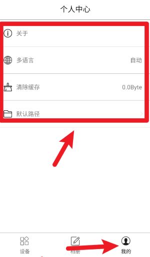 3、点击底部导航栏中的“我的”图标进入个人中心,在此页面可查看关于信息、切换多语言、清理缓存及设置默认路径。