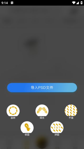 3、点击中间的创作按钮,导入PSD文件,然后进行旋转、填充、平铺、修图以及拼图等功能的操作;