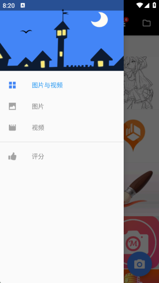 2、点击左上方库旁边的三条线图标即可选择不同的分类,主要包括图片与视频、图片、视频三大版块;