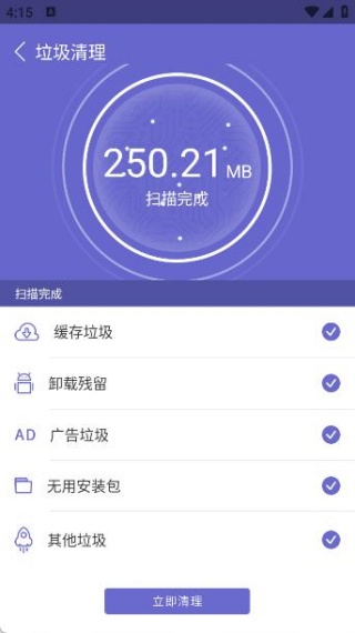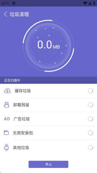 2、点击垃圾清理按钮,App将自动扫描手机中的缓存垃圾、残留文件、广告垃圾等无用数据。