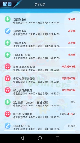 4.作业记录,查看听说写的作业的记录,同时也可以看到作业详情已经分数;