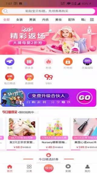 2、首页产品的划分很详细,专业省钱的购物商城。