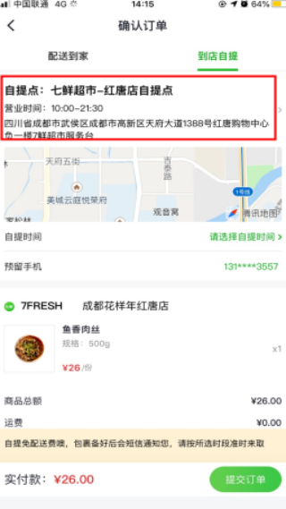 2、选择我们目标的七鲜超市,能看到相应的营业时间与详细地址信息,确认无误后下单就能到店自提啦!