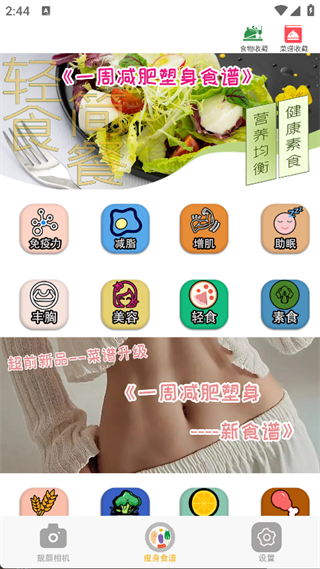 4. 点击页面下方的‘瘦身食谱’,还可以看到各类健康食谱,如减脂、增肌、美容等。
