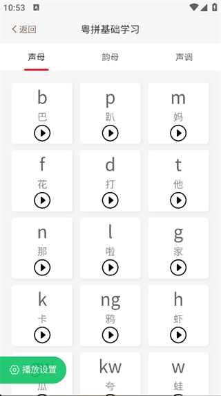 4. 点击首页的粤语拼音,即可看到详细的粤语拼音基础学习功能。