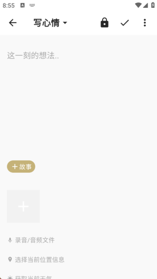 3、点击“+”号即可进行写心情,添加自己的想法、故事以及录音或音频文件,还可以选择当前位置等内容;