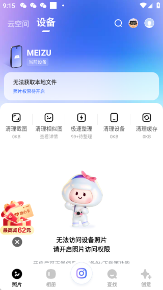 1、在照片页面中提供了清理各种重复、无用图片的服务,同时可以开启照片权限进行访问手机中的照片;